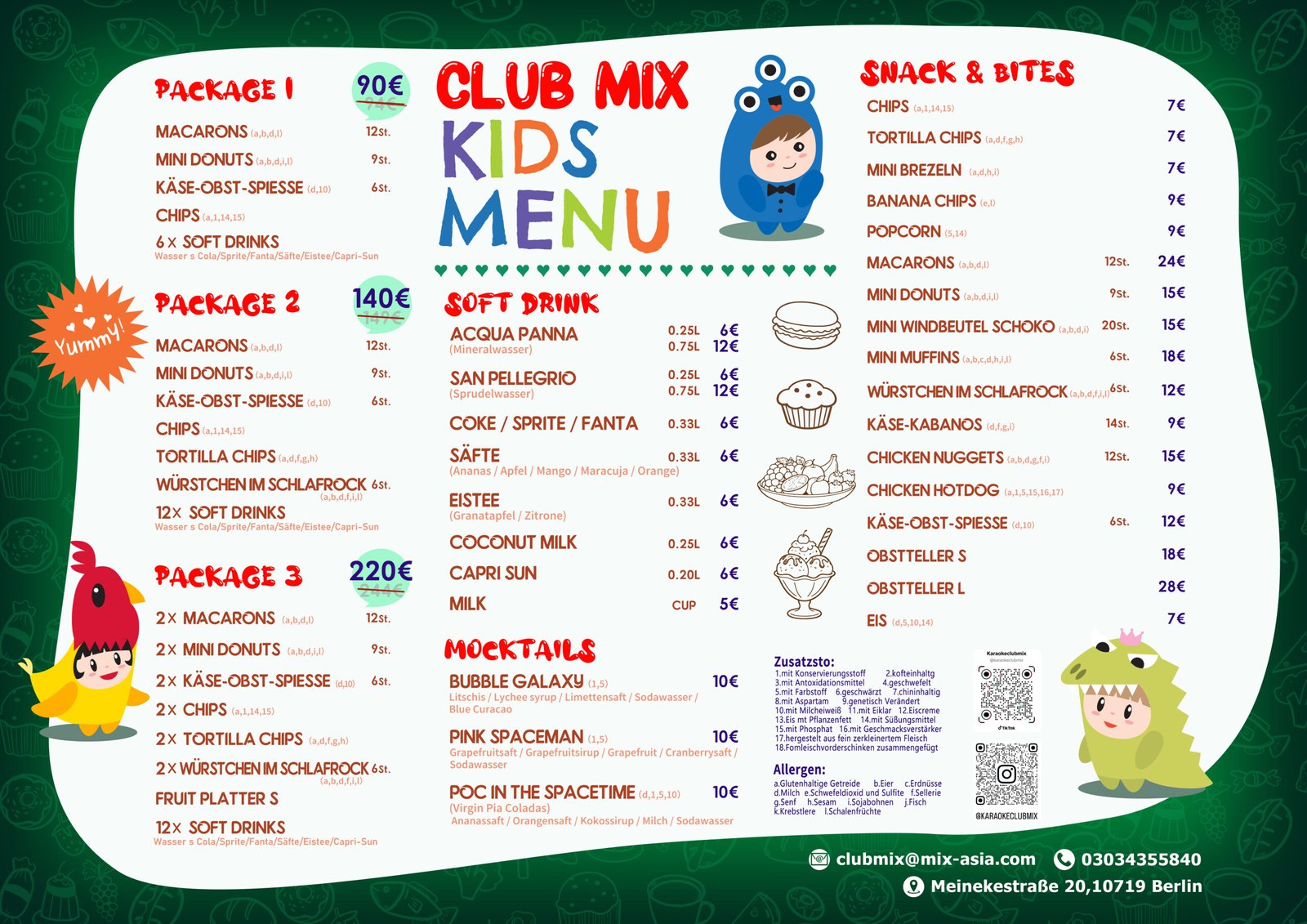 Einzelne Snacks aus dem Kindermenü sind ausschließlich für Kindergeburtstage vorgesehen und nicht Teil des regulären Angebots.